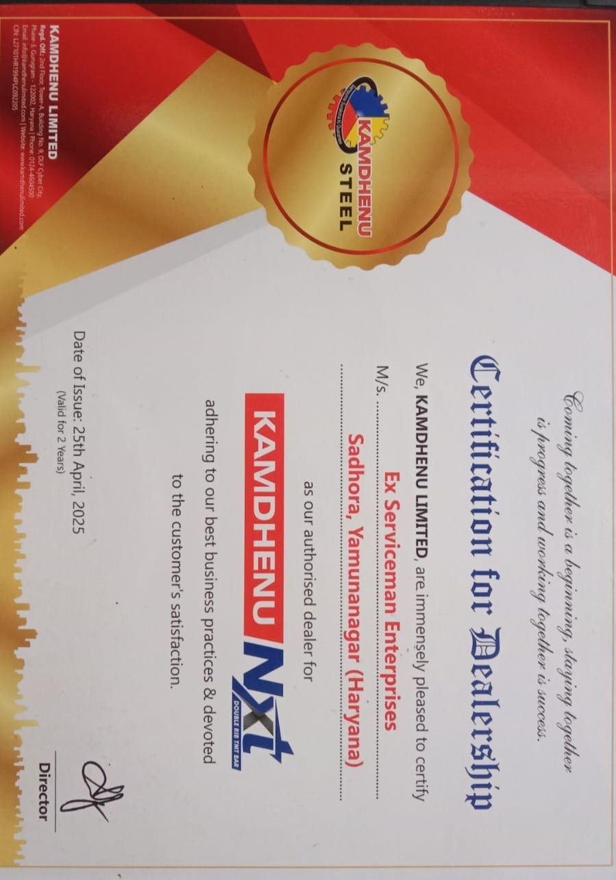 Ex Serviceman Enterprises, based in Sadhora, is an authorised dealer of Kamdhenu Nxt, No. 1 selling TMT steel brand in India.